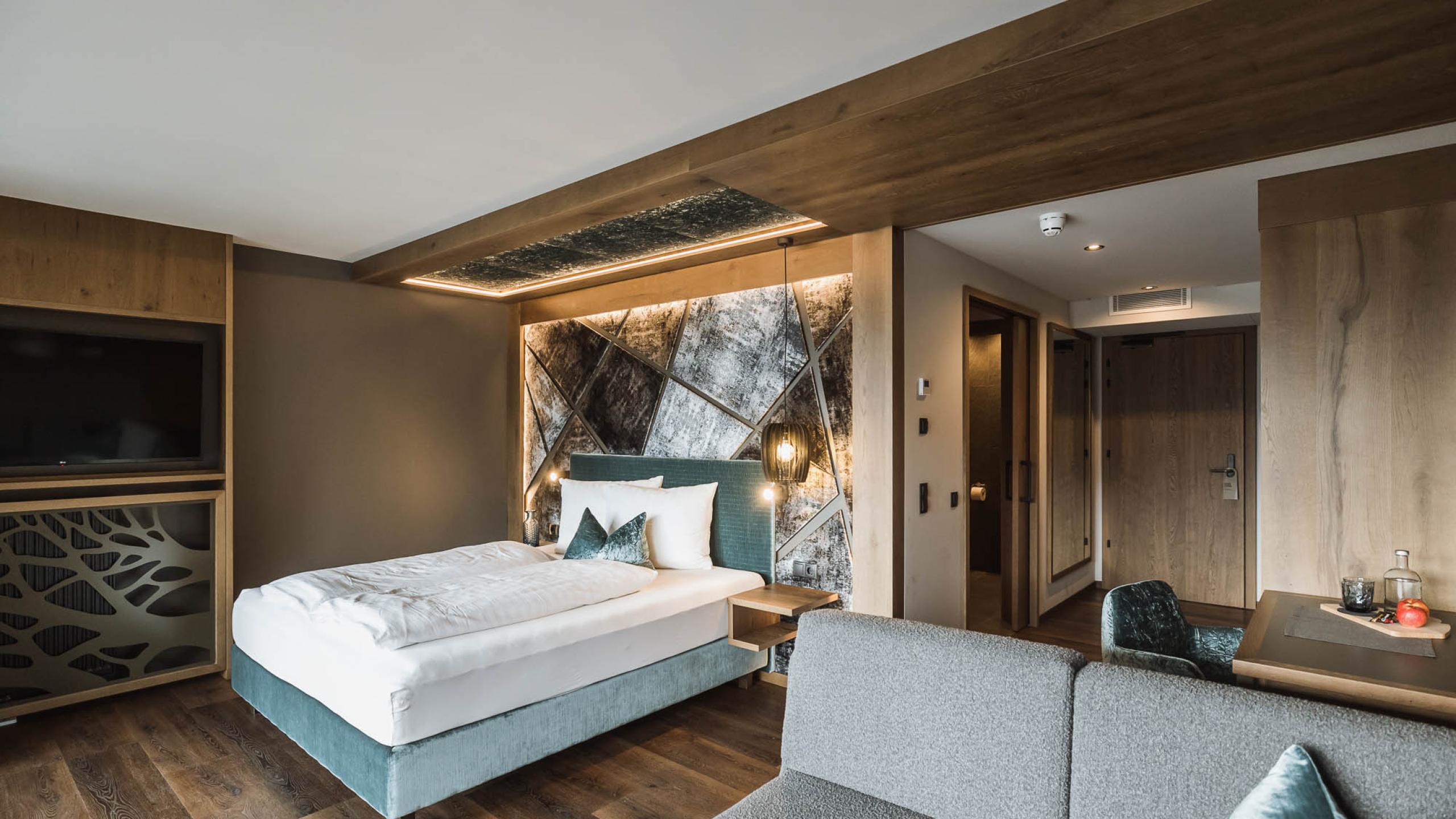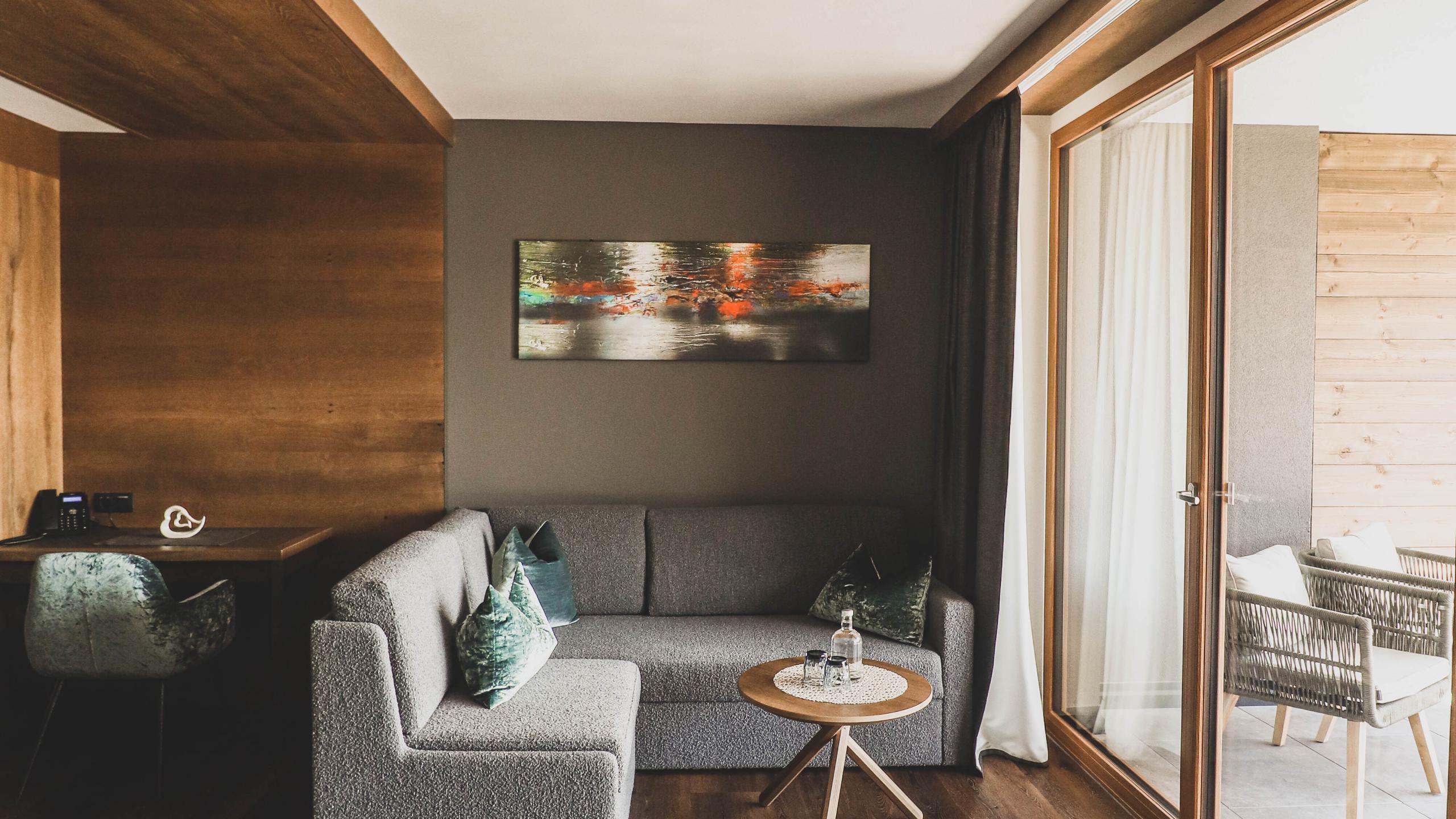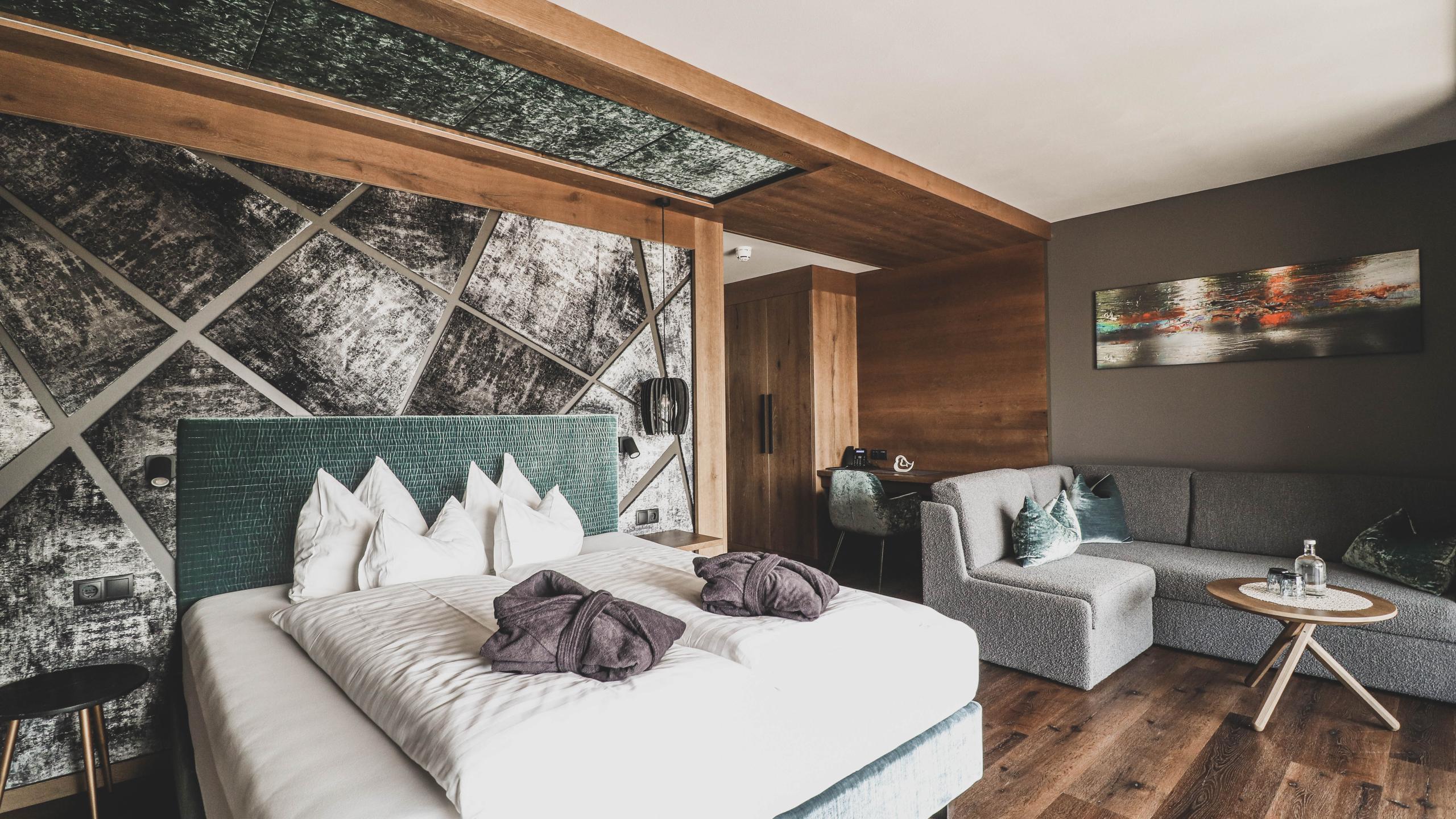 Our luxurious Alpin Lodge with its Alpine ambience is fitted with modern velvets and furniture made from local oak. It features a combined living and bedroom with a seating area, a large bathroom, and a south-facing panoramic loggia for an XXL view.