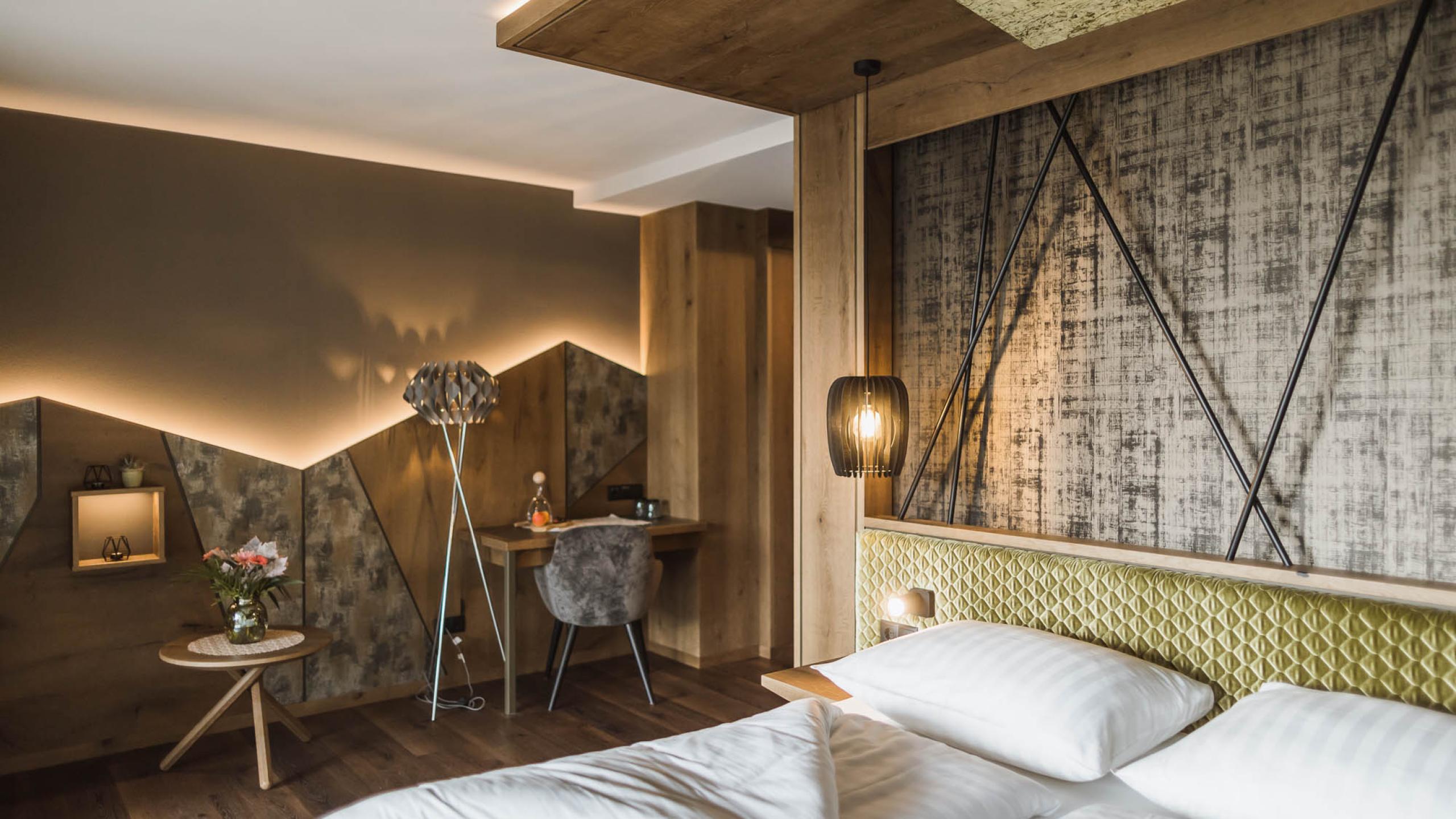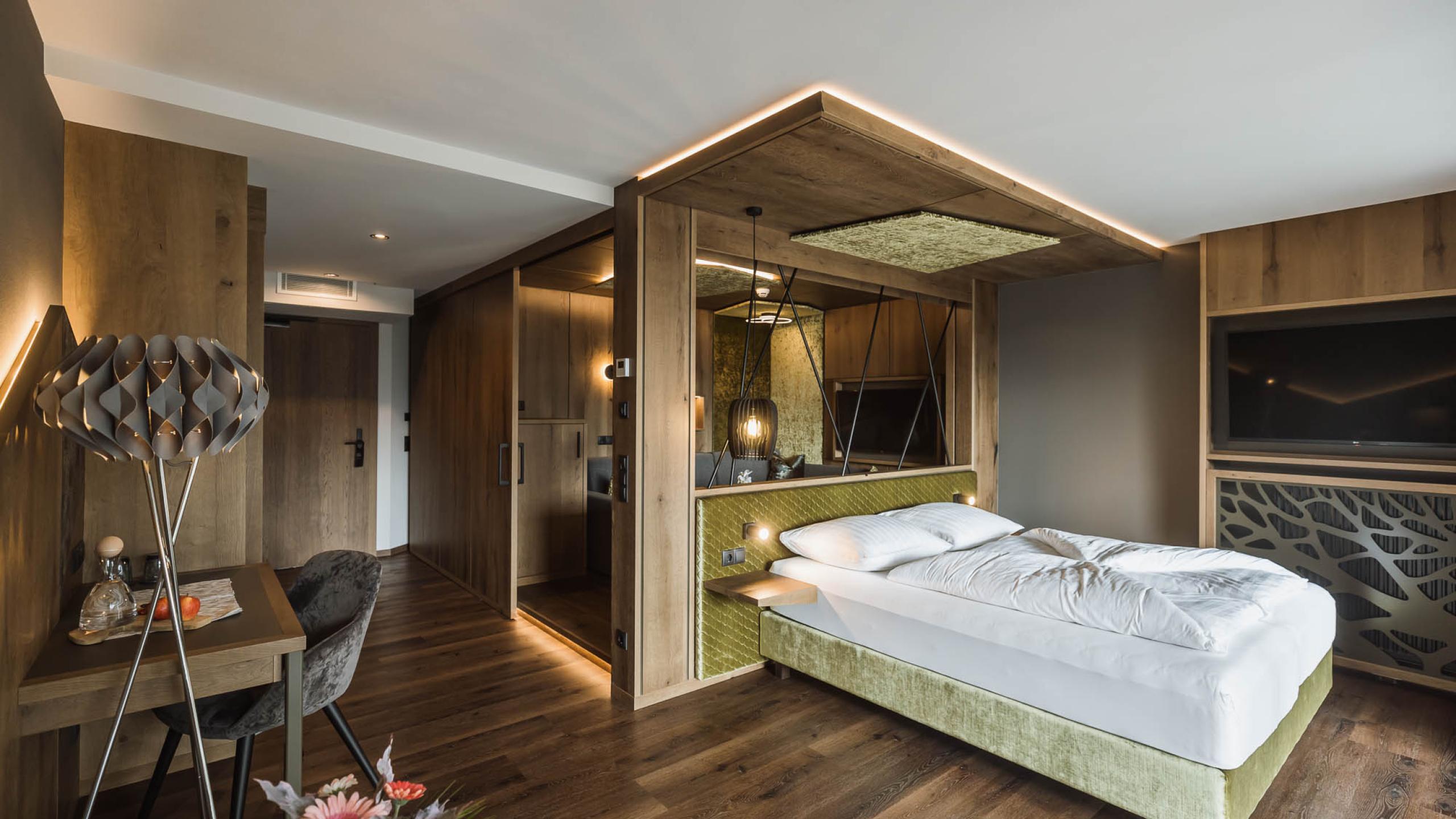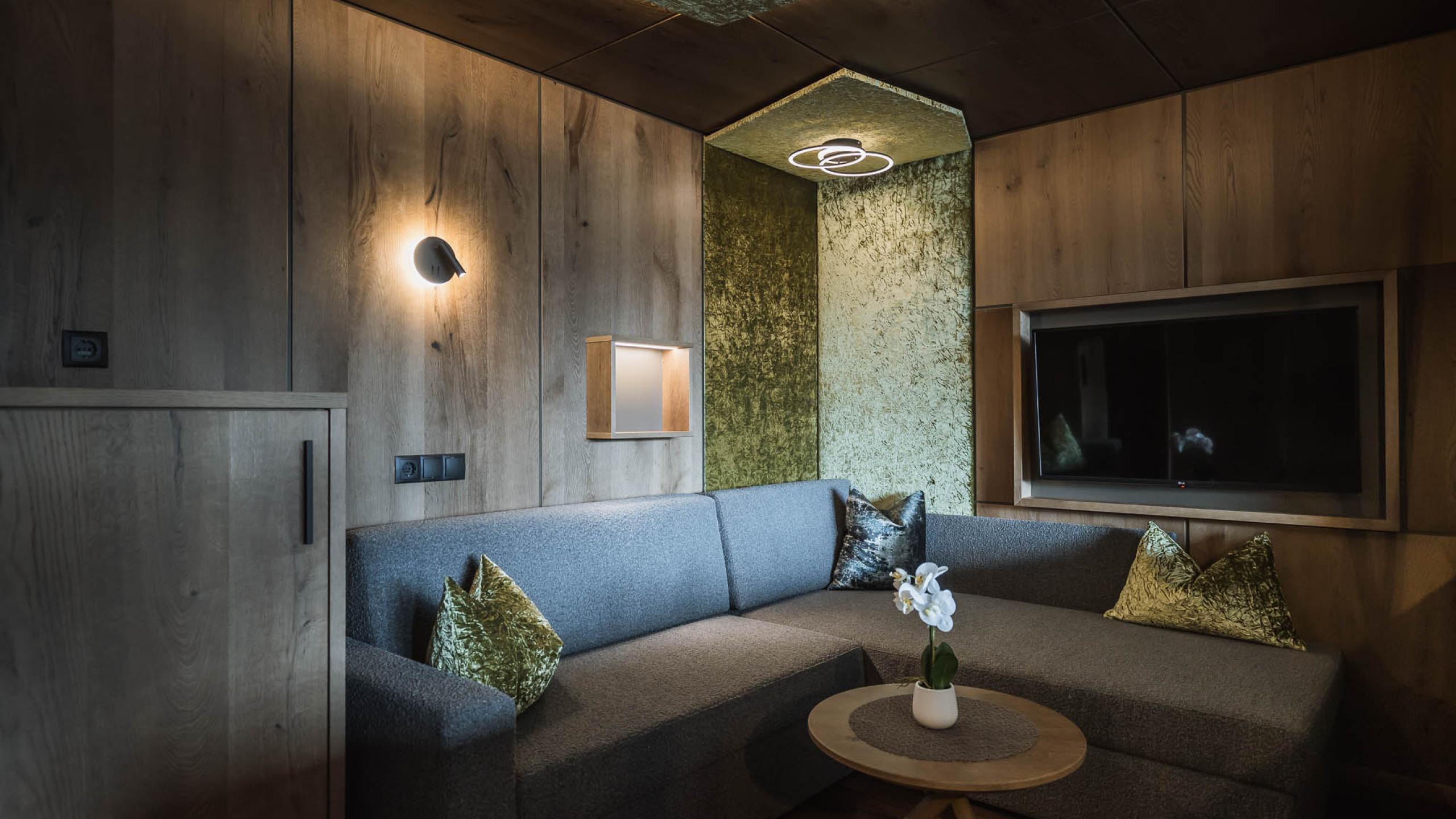 This suite is a dream come true: enjoy the best that a modern Alpine lifestyle has to offer! Lovingly furnished with oak, fine velvets, and romantic lighting, this suite features a heavenly bedroom, a spacious bathroom with separate WC, and a cosy, separable living area with sofa, large floor-to-ceiling windows, and a south-facing panoramic loggia with furniture that just invites you to relax while enjoying indescribably wonderful views and sunny moments. It’s a living dream for two adults or as a nest for families (two adults and two children).