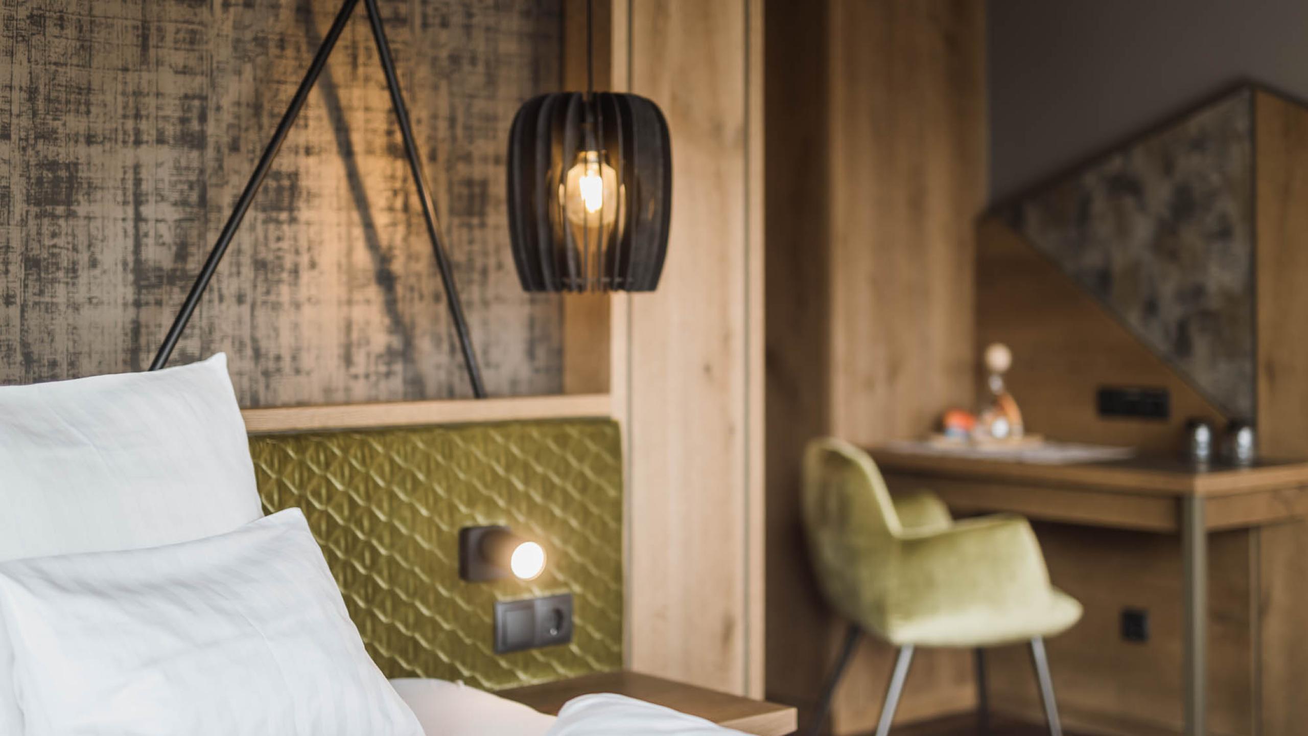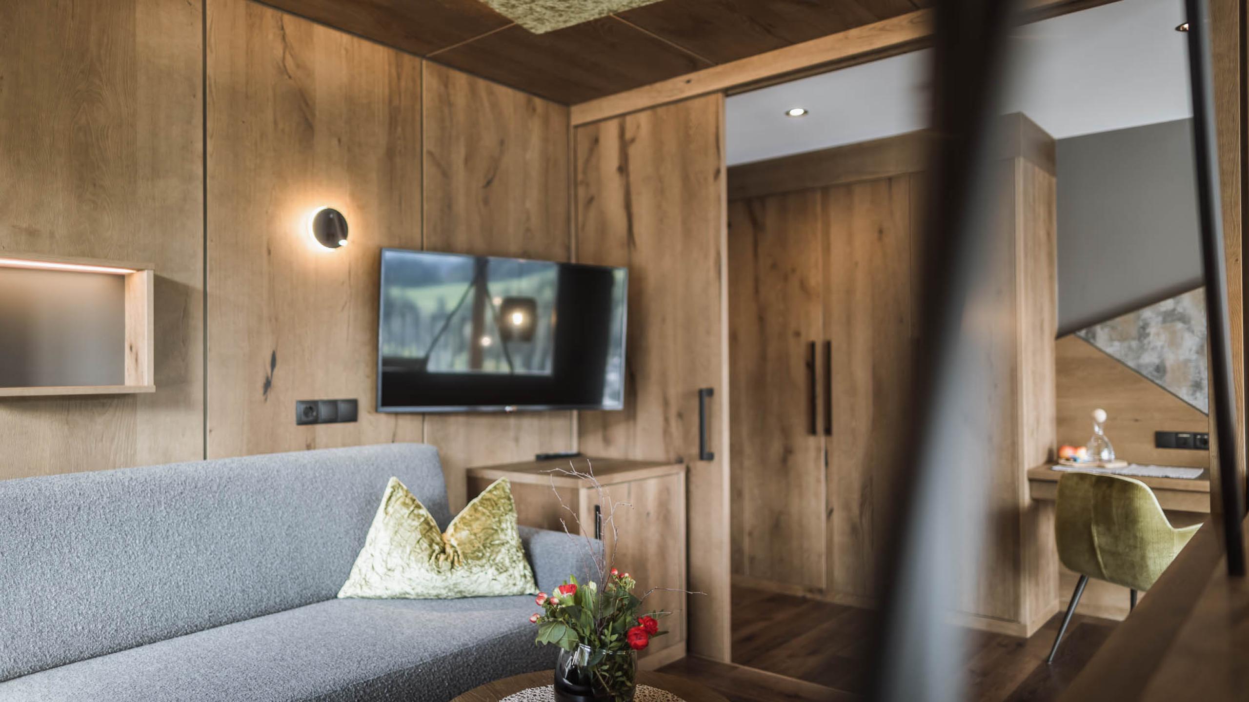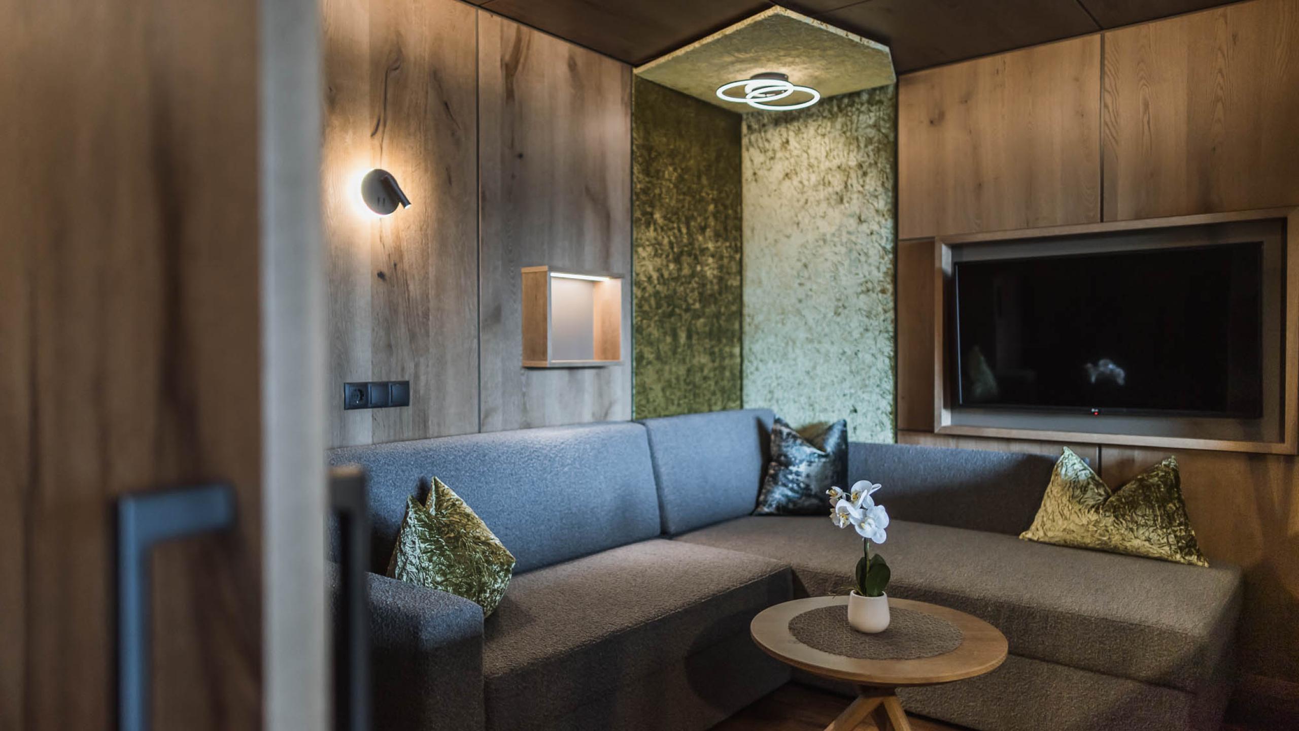 Enjoy the best that a modern, Alpine spa lifestyle has to offer in our Suite Molaris in the “Cubo”. Lovingly furnished with oak, fine velvets, and romantic lighting, this suite features a bedroom, a separable living area with cosy sofa, a spacious bathroom with separate WC, an infrared lounger, large floor-to-ceiling windows for an XXL view, and a south-facing panoramic loggia with furniture that just invites you to relax on the dreamy hammock.