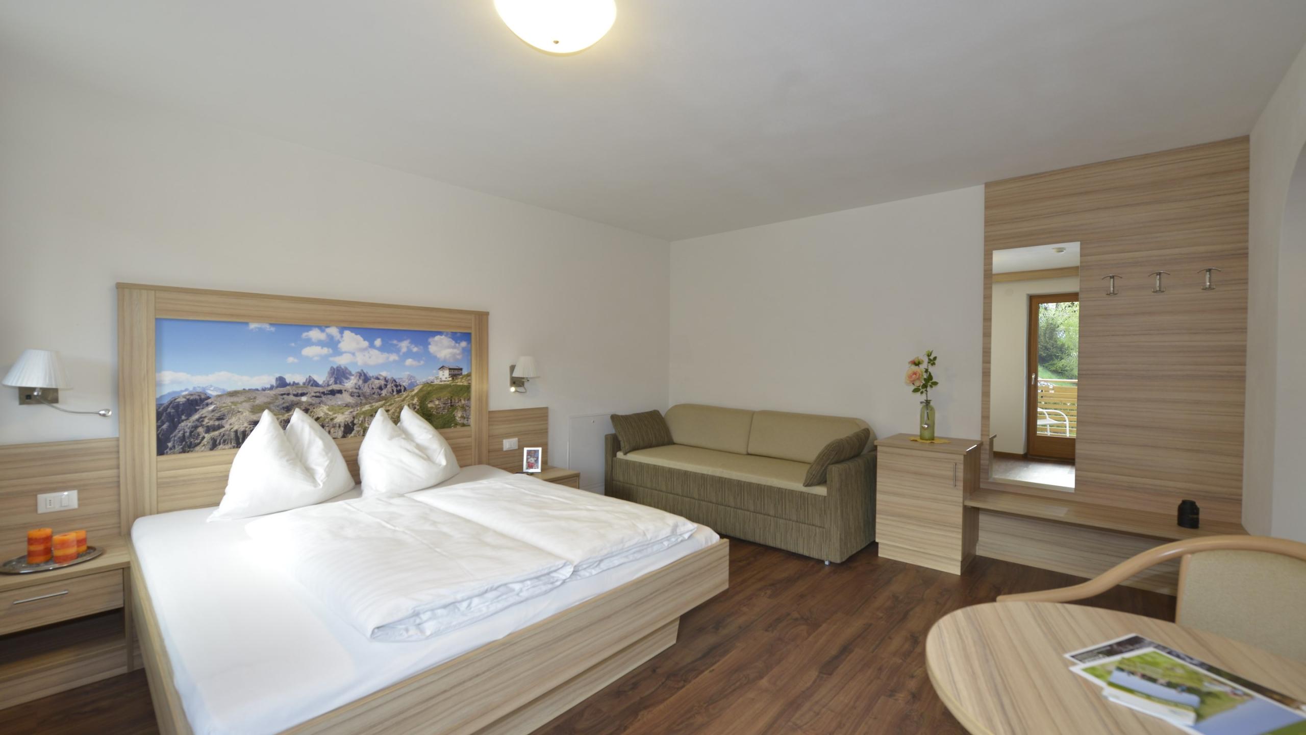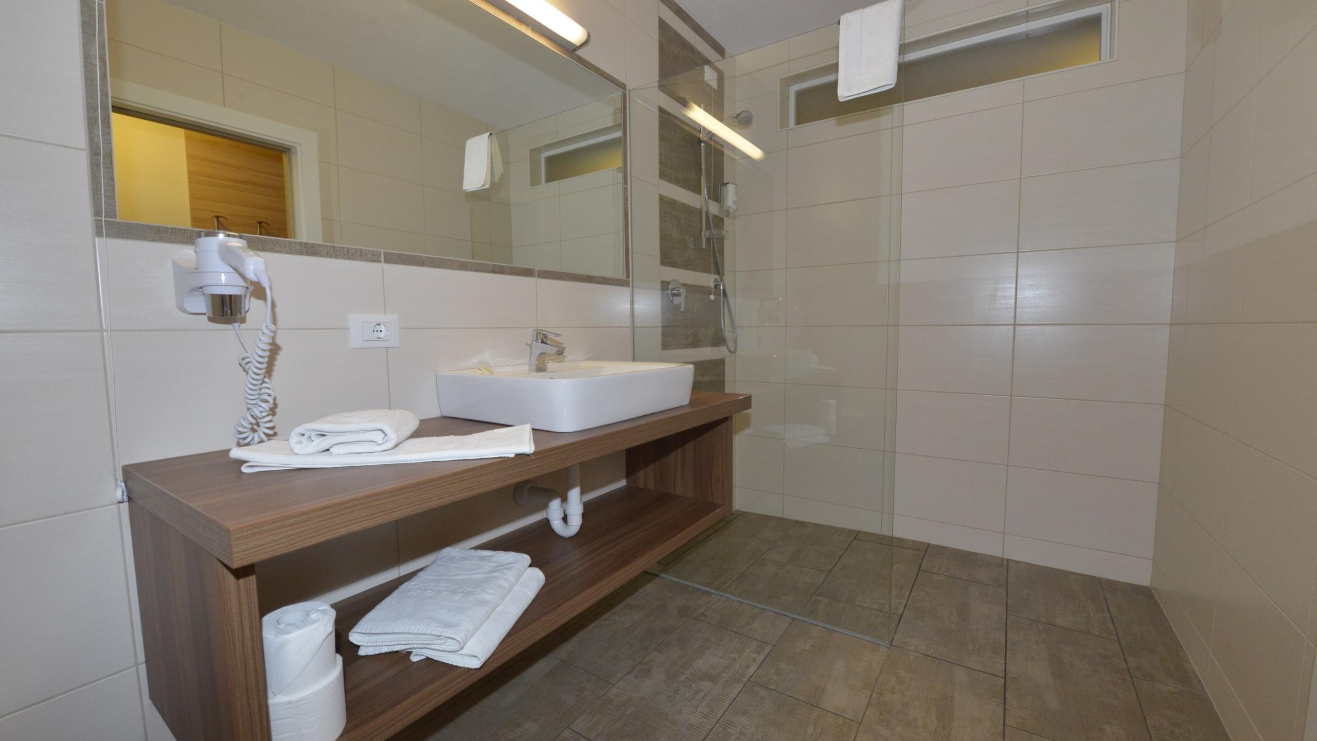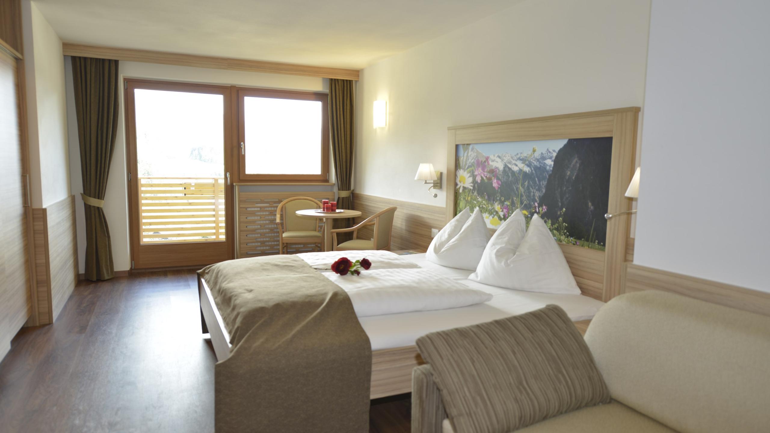 Einfaches Doppelzimmer im Erdgeschoss mit Balkon (eingeschränkte Sicht), Doppelbett, SAT-TV, Telefon, Safe, Spiegel und Klimaanlage. Das Bad verfügt über Dusche, WC und Fön. In jedem Zimmer steht eine Wellnesstasche mit flauschigem Bademantel und Saunahandtuch zur Verfügung.