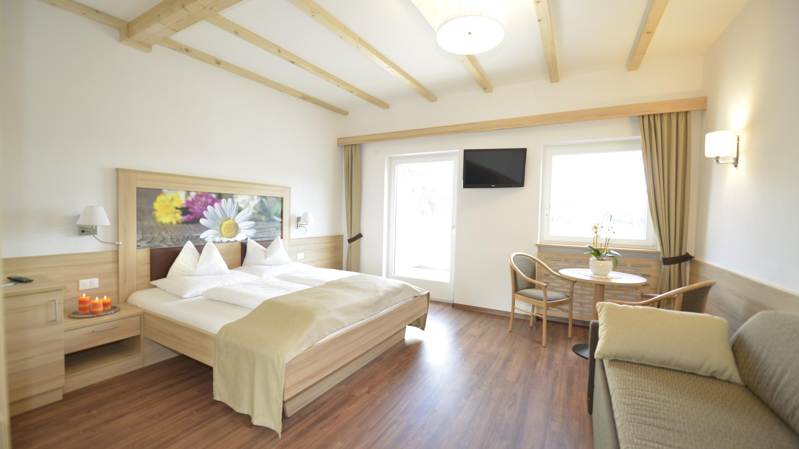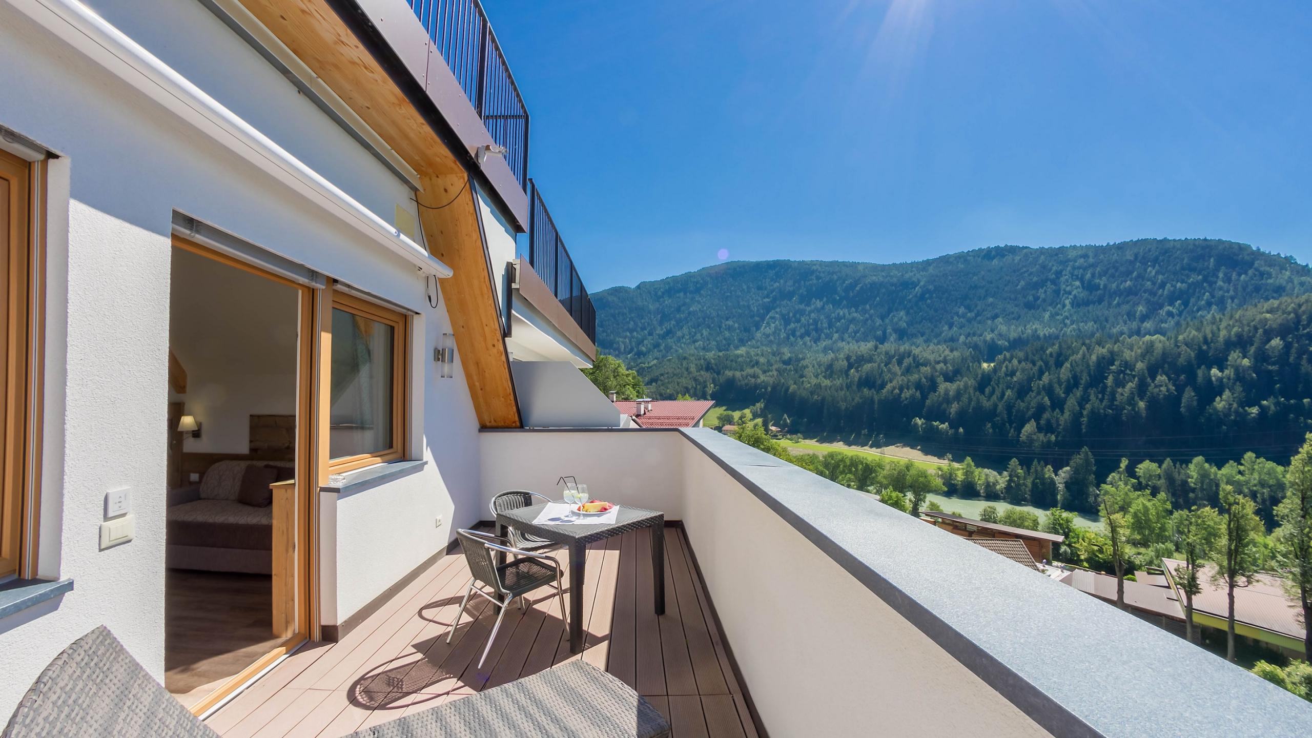 Großzügiges Doppelzimmer mit Klimaanlage mit Panorama-Dachterrasse im 4.Stock. Das Zimmer verfügt über Sonnenliegen, Sonnenmarkise und traumhafter Aussicht über Mühlbach bis weit hinein ins Eisacktal.